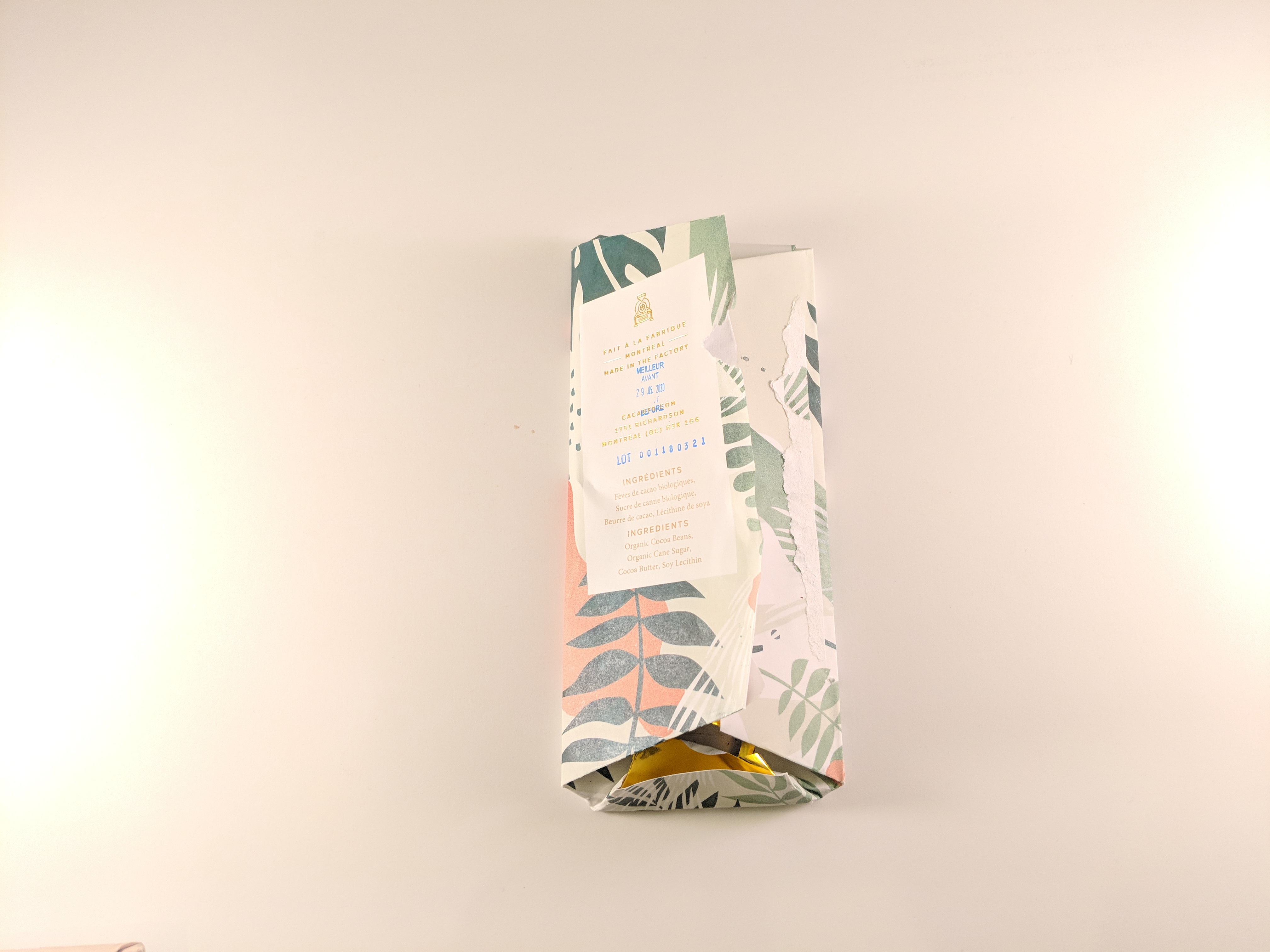 100%. Smooth mix of bitter-sourness — tastes like I’m eating 100% chocolate 🙂 I wouldn’t recommend this bar to folks who aren’t into the “100%” stuff. While it was nice to sample, I prefer nuttier chocolates, so I would likely go for a mellower 100% bar (yes, I’ve had nuttier, mellower 100% bars). This also left a bit of an aftertaste.