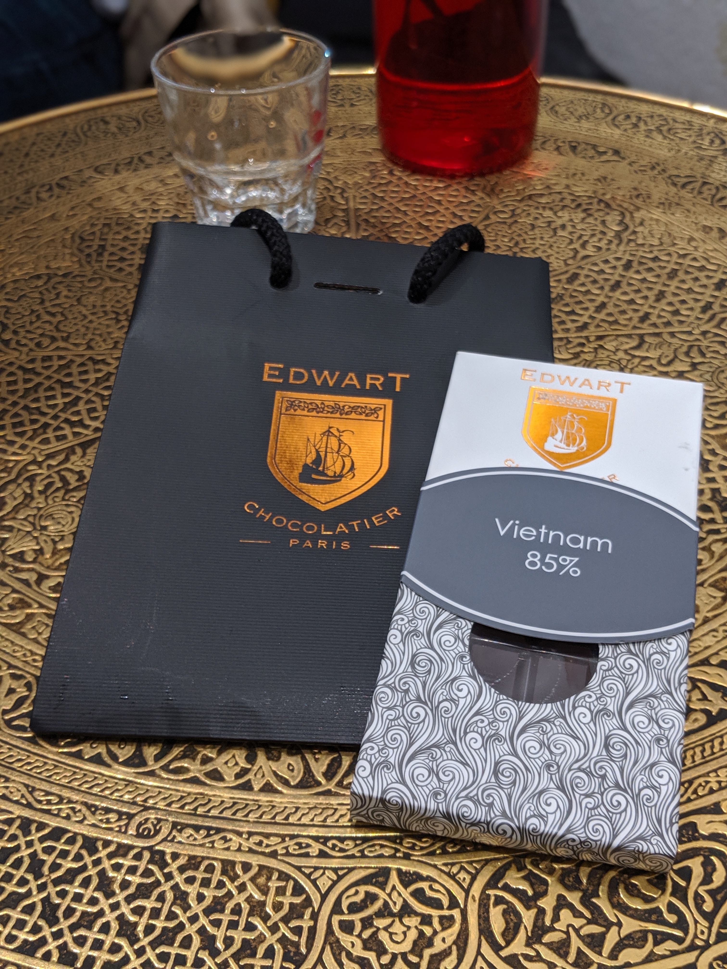 This bar was a gift from my manager. We were in Paris for a work meeting. He knew I was a fan of chocolate and picked this up for me when he was exploring the Le Marais neighborhood.